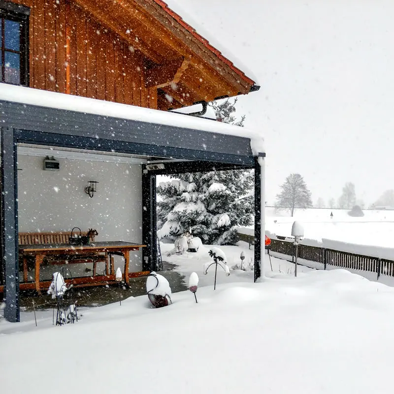Wir fertigen bis zu einer Schneelast von 460kg/m² nach den örtlichen Lastangaben. Bei uns selbstverständlich – bei geschlossenem Dach. Deshalb benötigen wir keinen Schneesensor der das Dach bei Schneefall öffnet. Ihr Vorteil: Sie müssen Ihre hochwertigen Gartenmöbel nicht jeden Herbst in den Keller tragen!