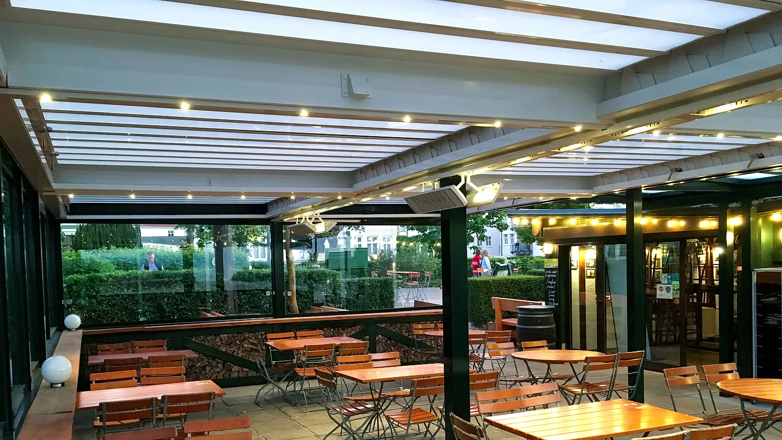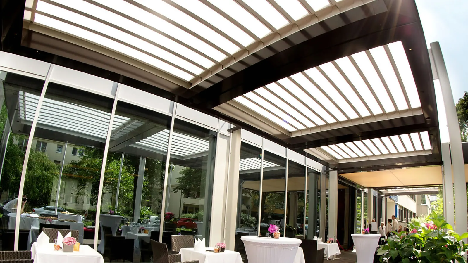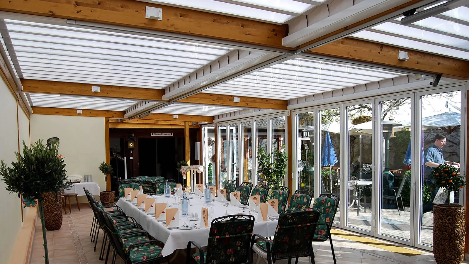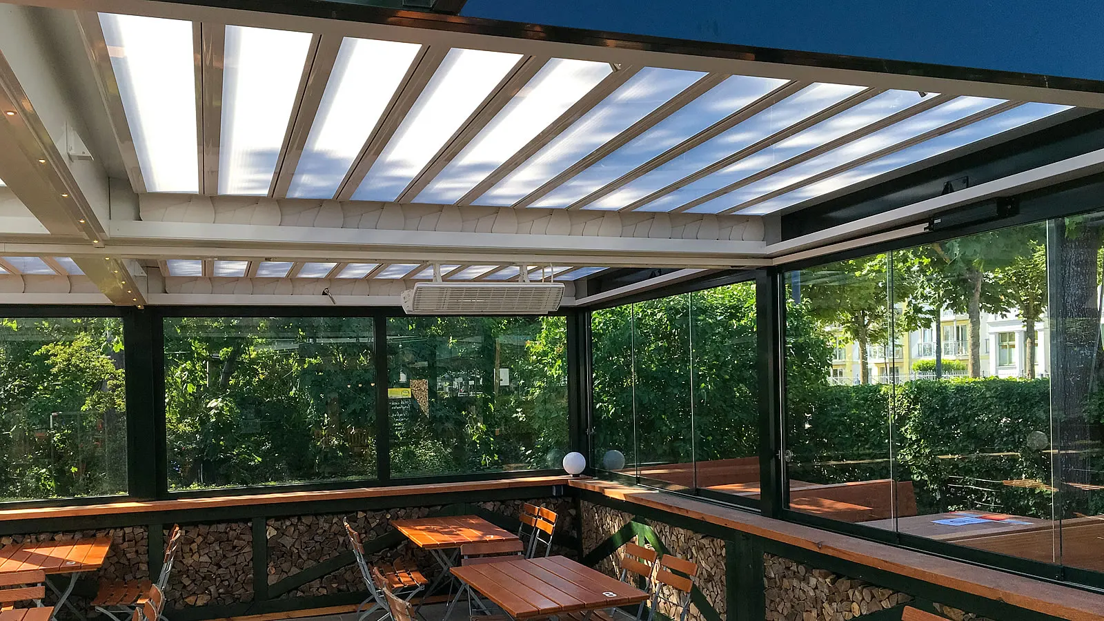 Innenansicht - Restaurantterrasse mit Lamellendach und seitlicher verschiebbarer Verglasung als Wind- und Wetterschutz.