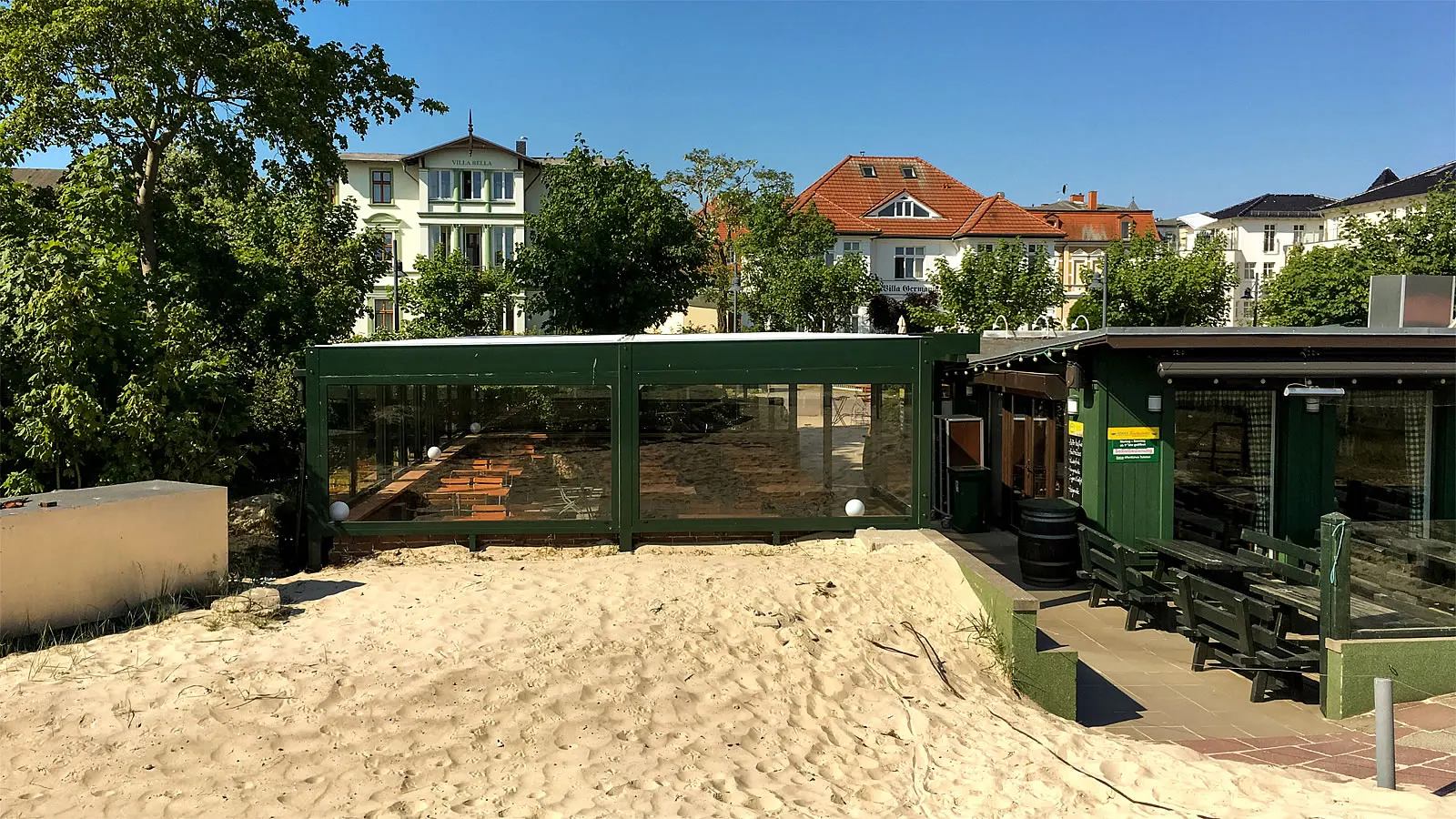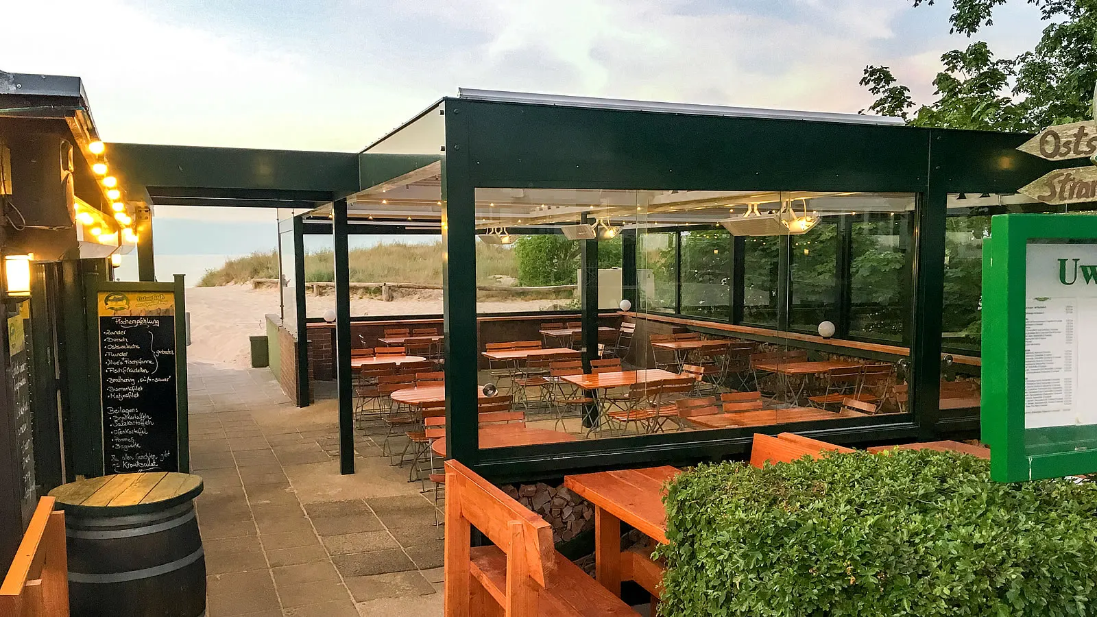 Lamellendach an einem Restaurant auf Usedom, Ostsee - Außenansicht Rückseite.