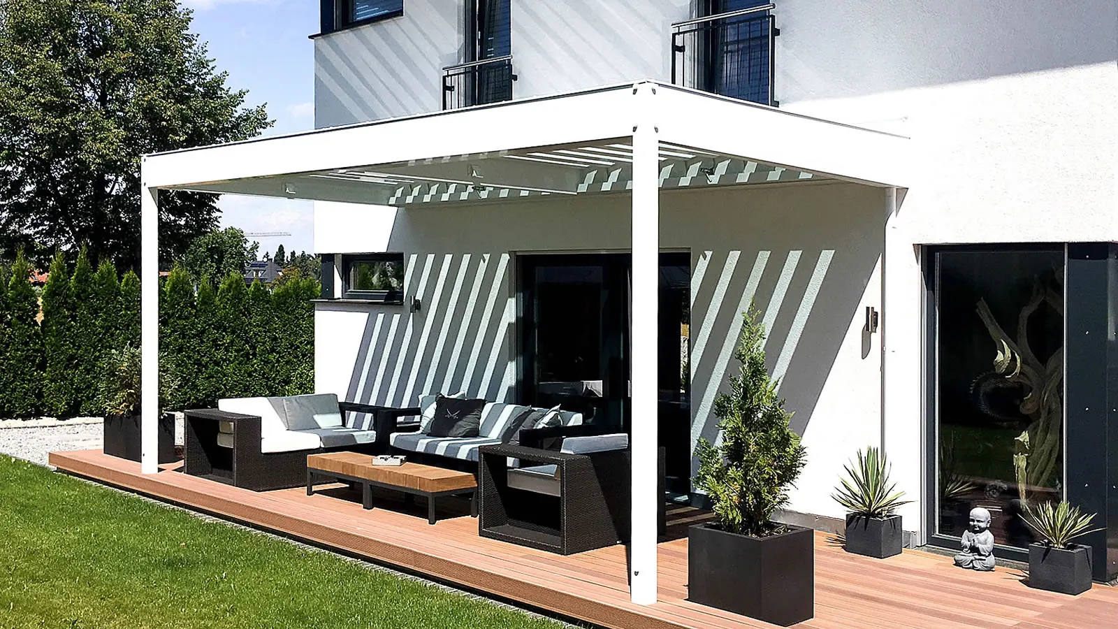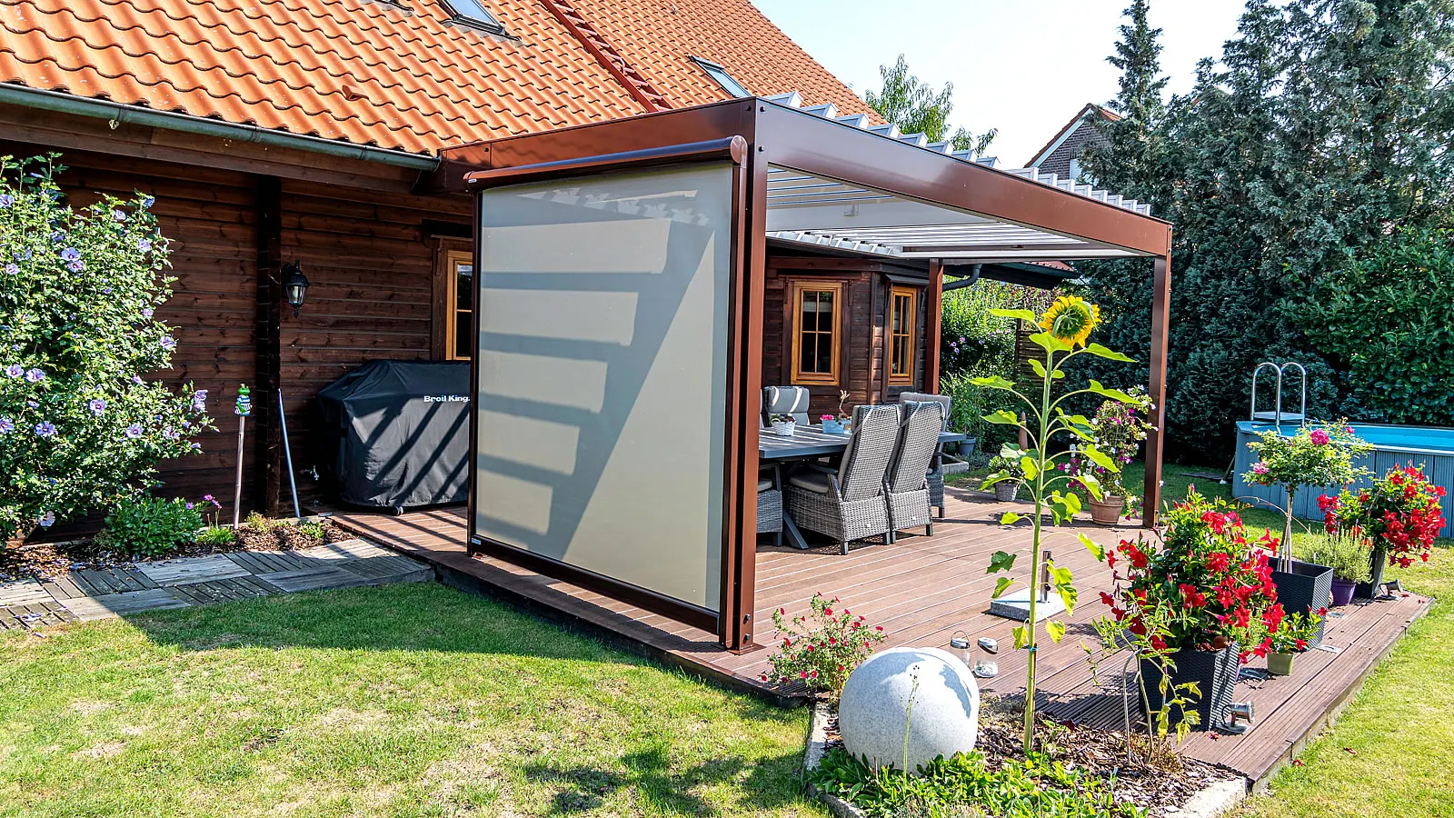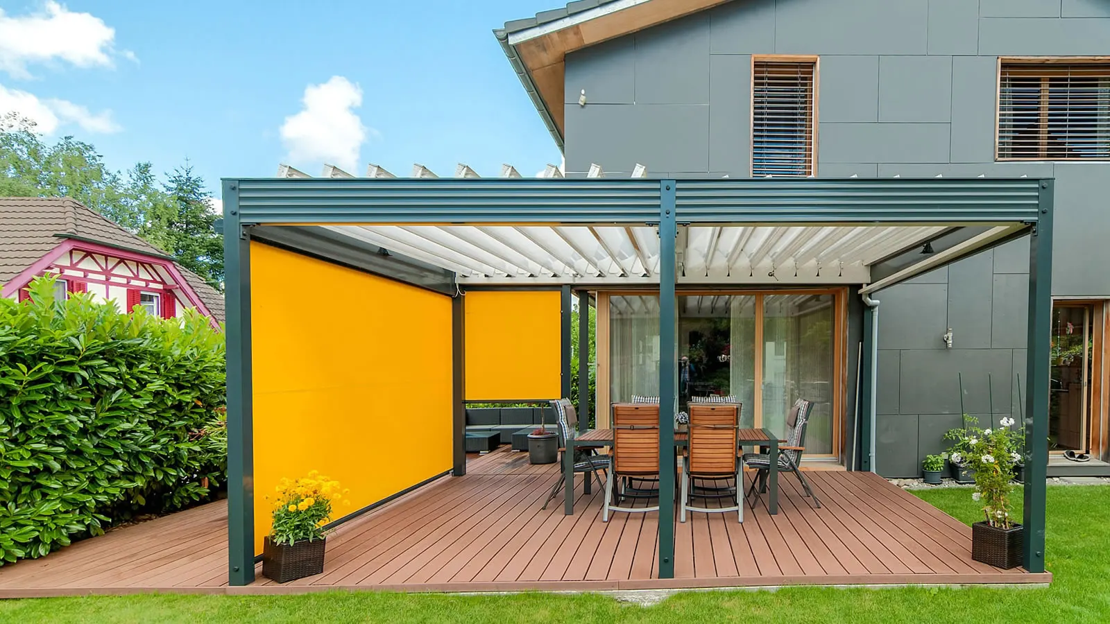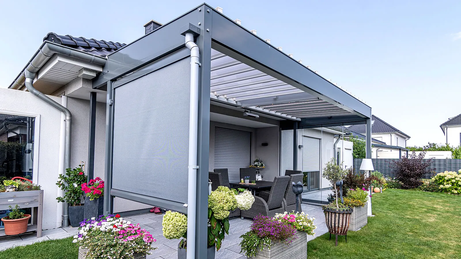 Lamellendach aus Aluminium mit einer seitlichen Markise.