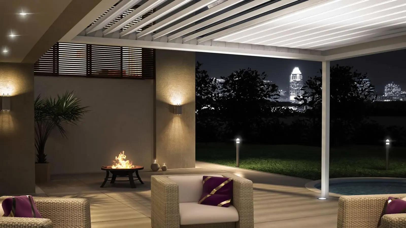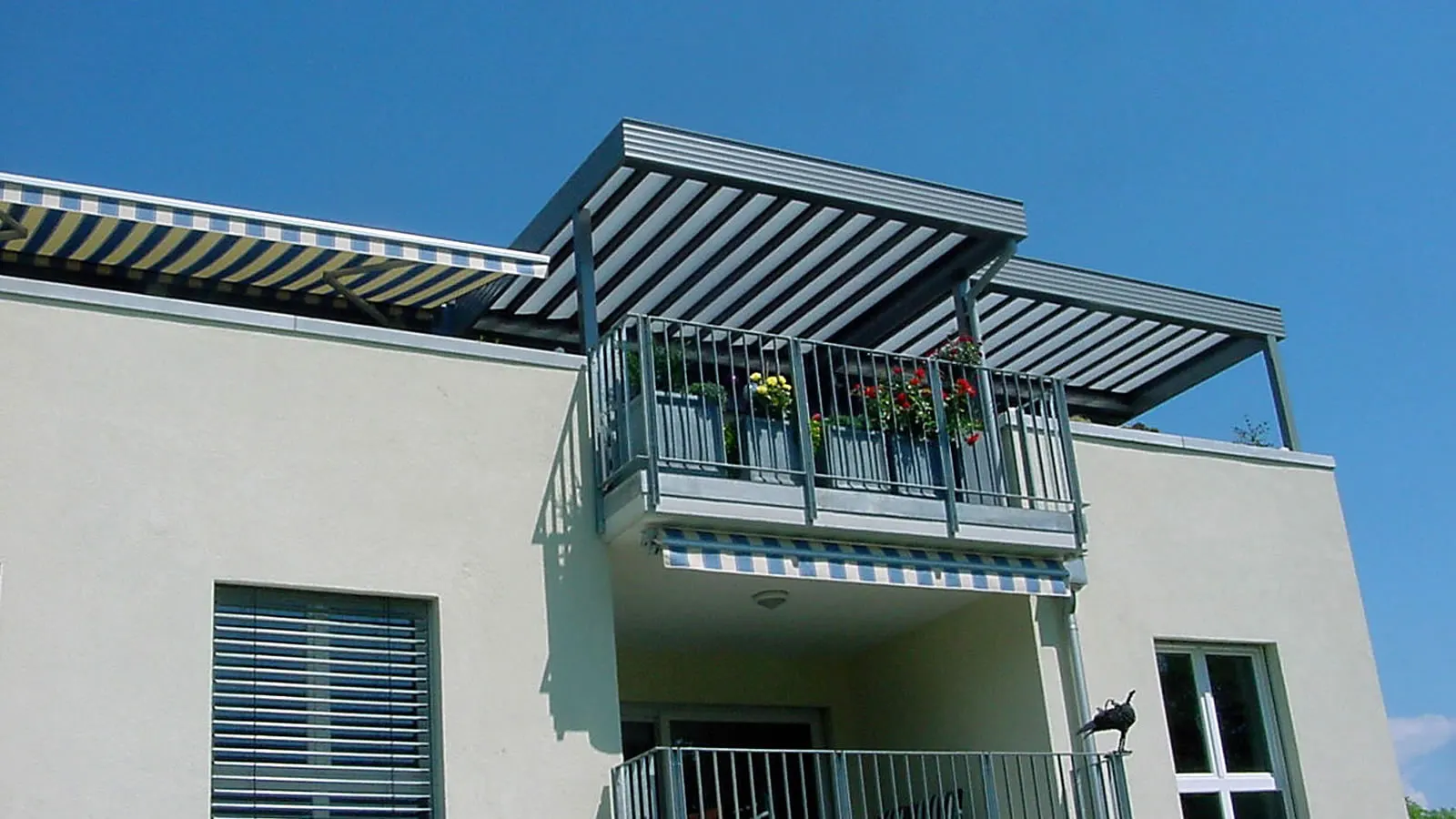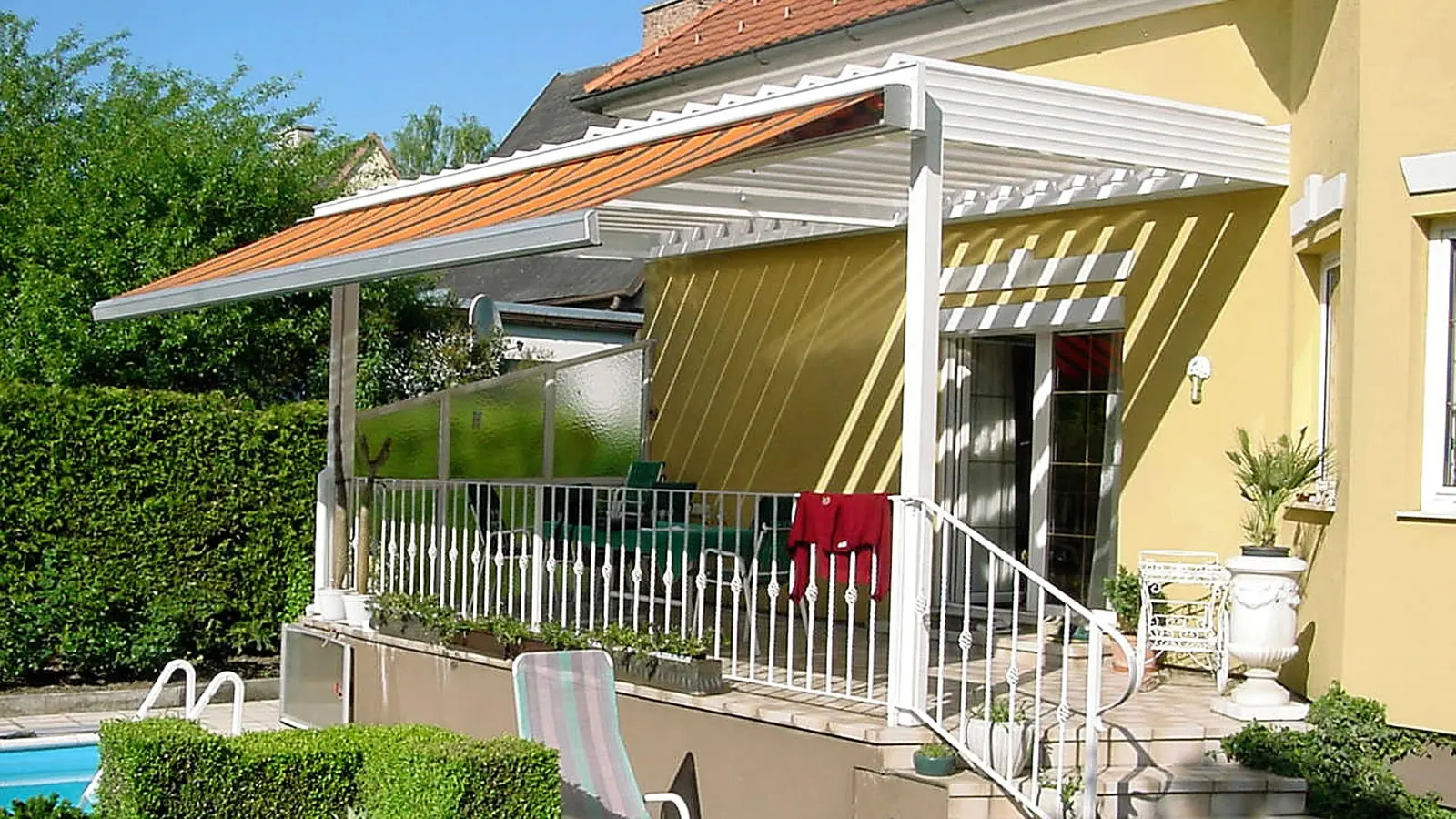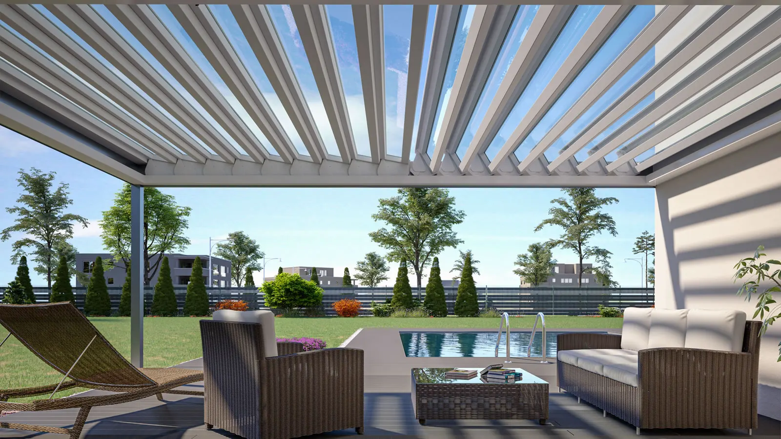 Lamellendach aus Aluminium mit einer seitlichen Markise.