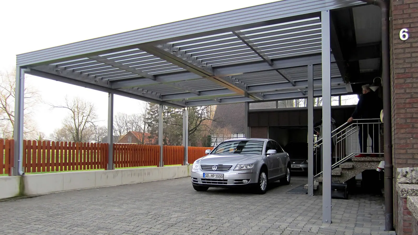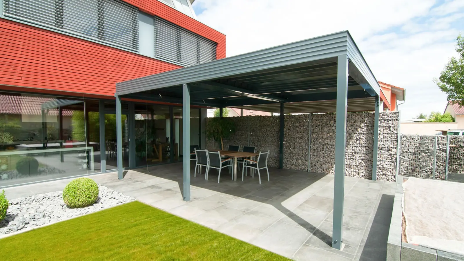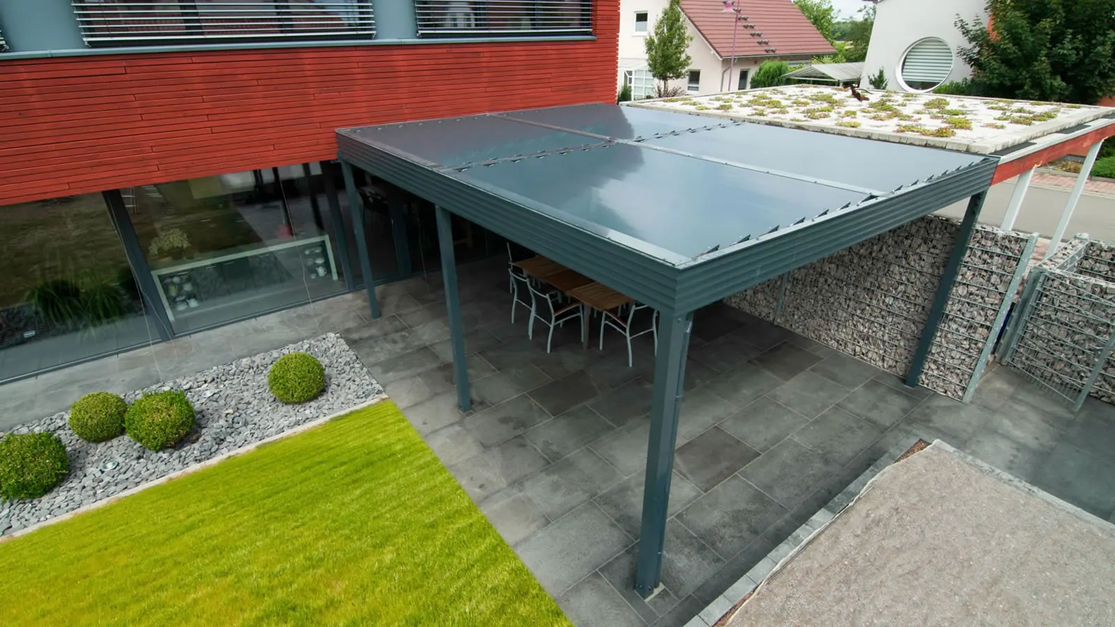 12 Monate im Jahr nutzbar: Unser winterfestes Lamellendach. Gegen rutschende Lasten empfehlen wir immer ein Schneegitter.