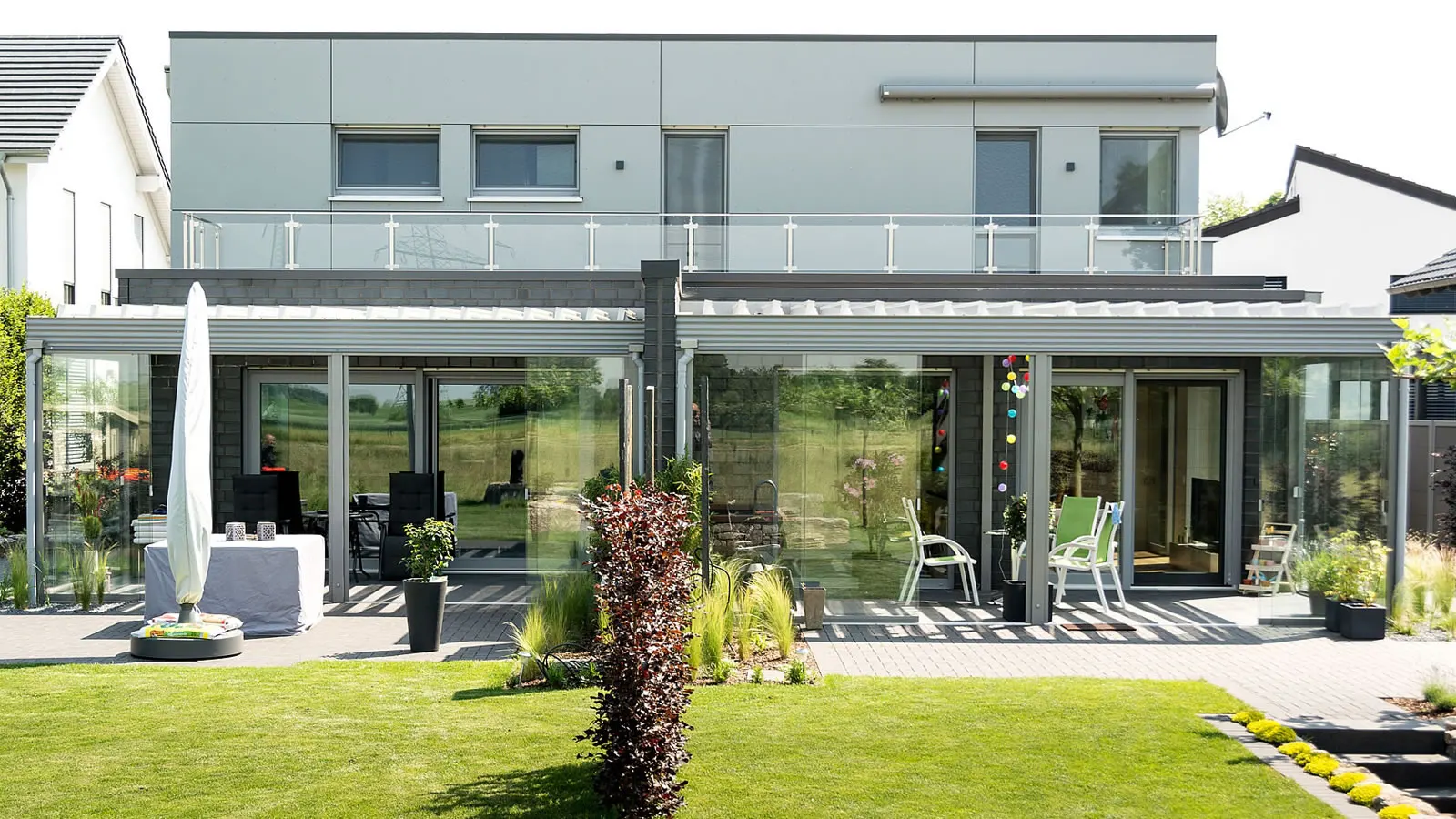 Die Terrassenüberdachung ist mit einer Schiebeanlage als Windschutz versehen.