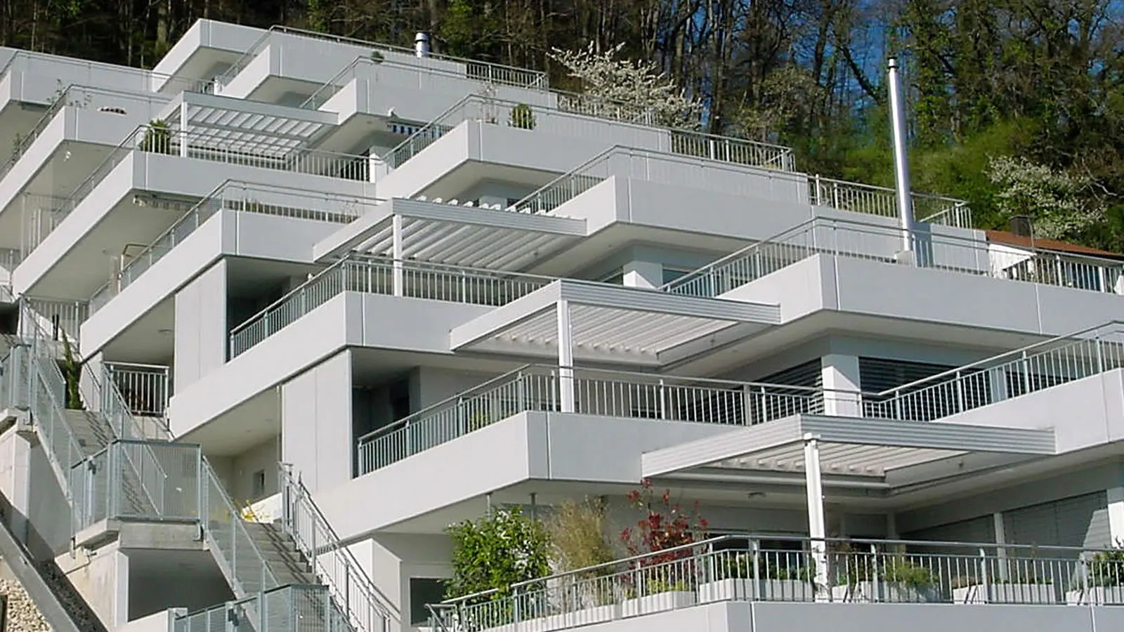 Architektonisch einheitlich angepasste Lamellendächer in einer Terrassenhaus Siedlung.