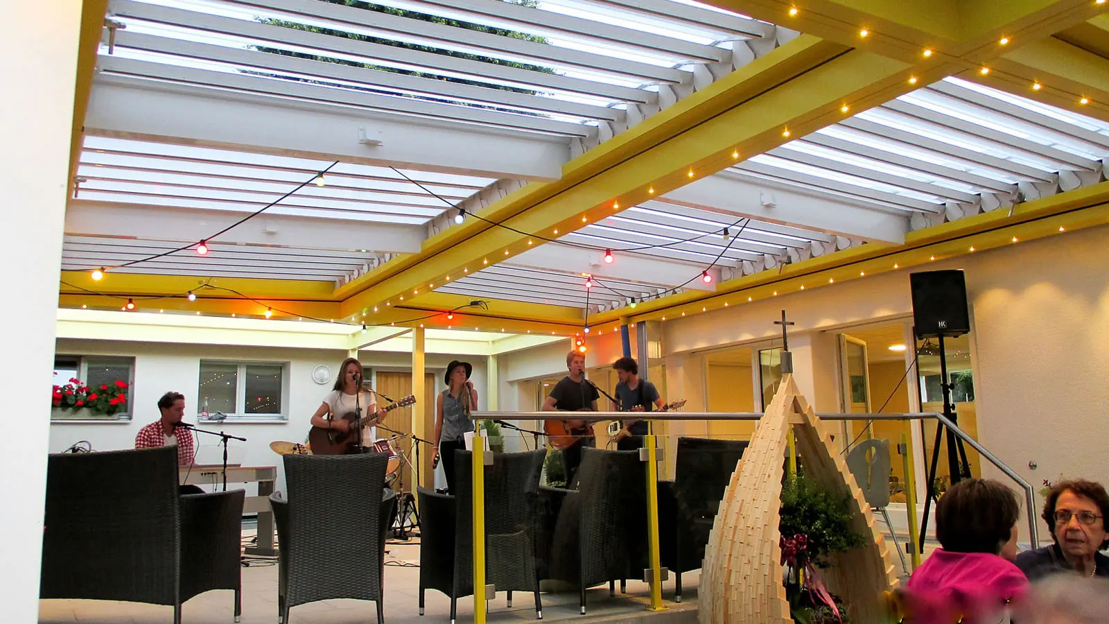 Großes Lamellendach als Innenhofüberdachung eines Gemeindezentrums.