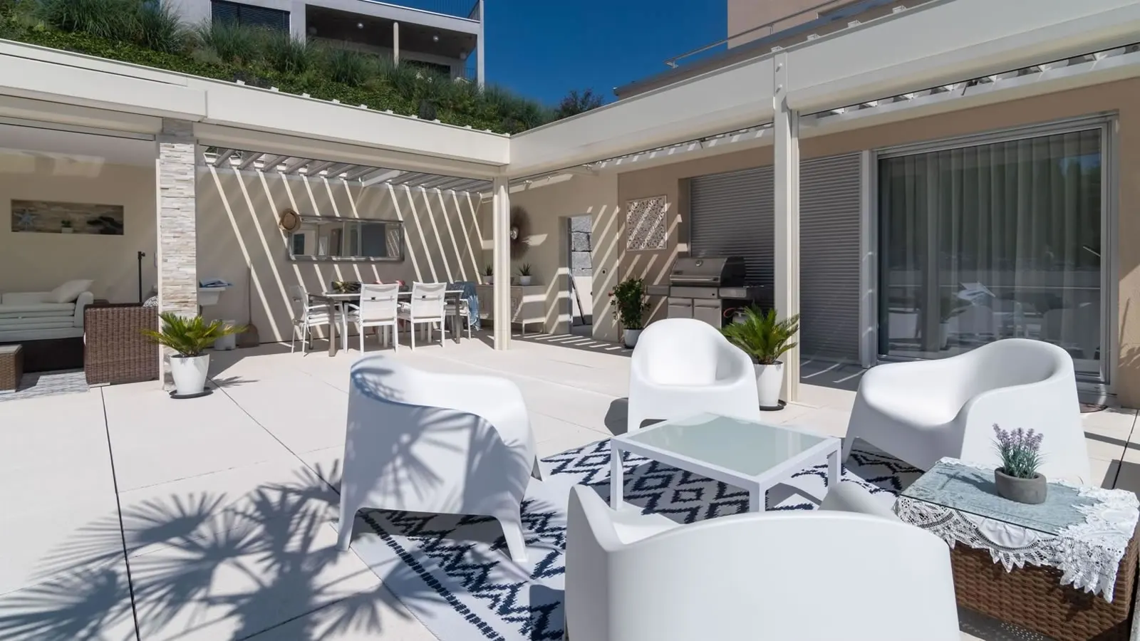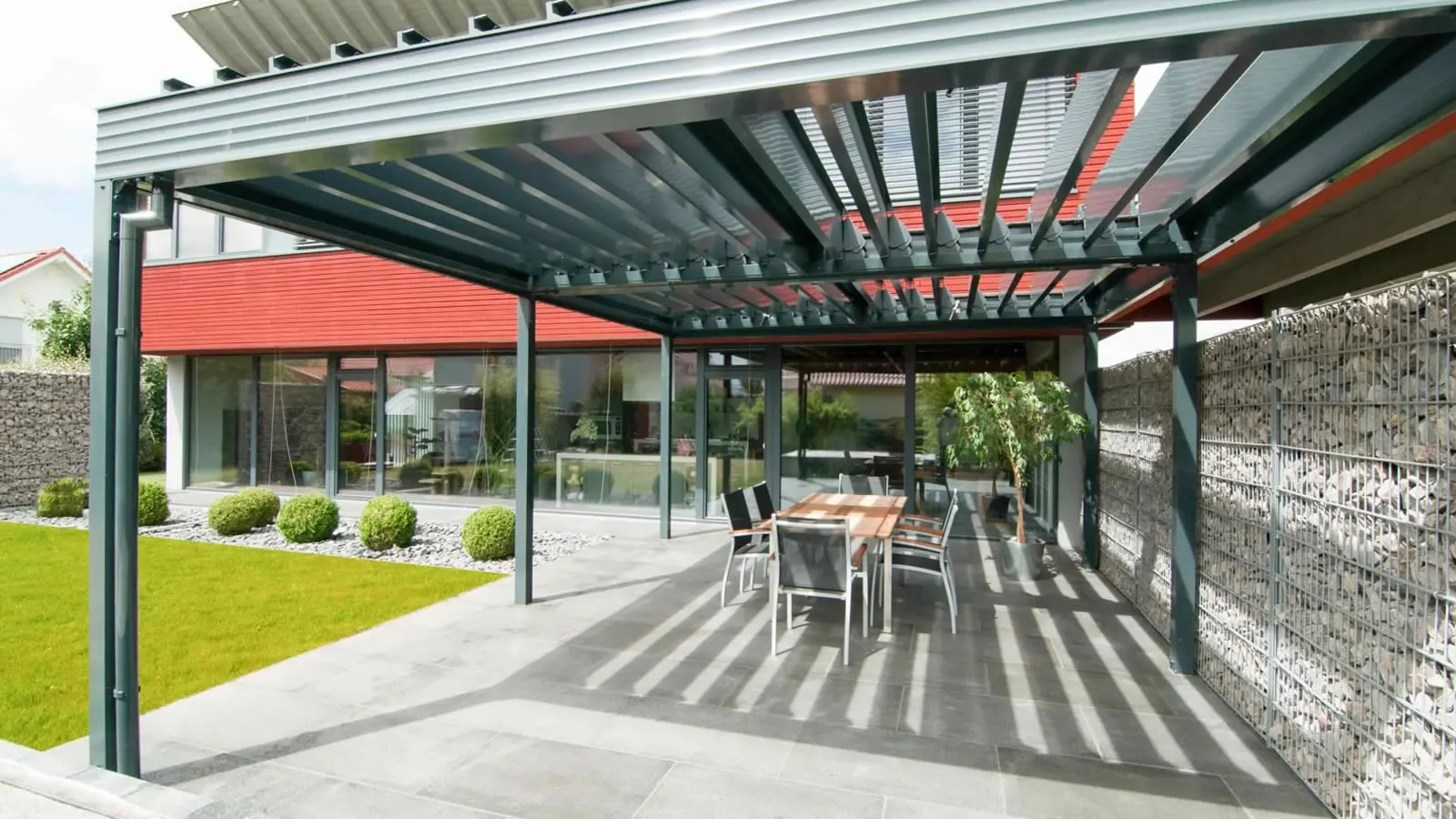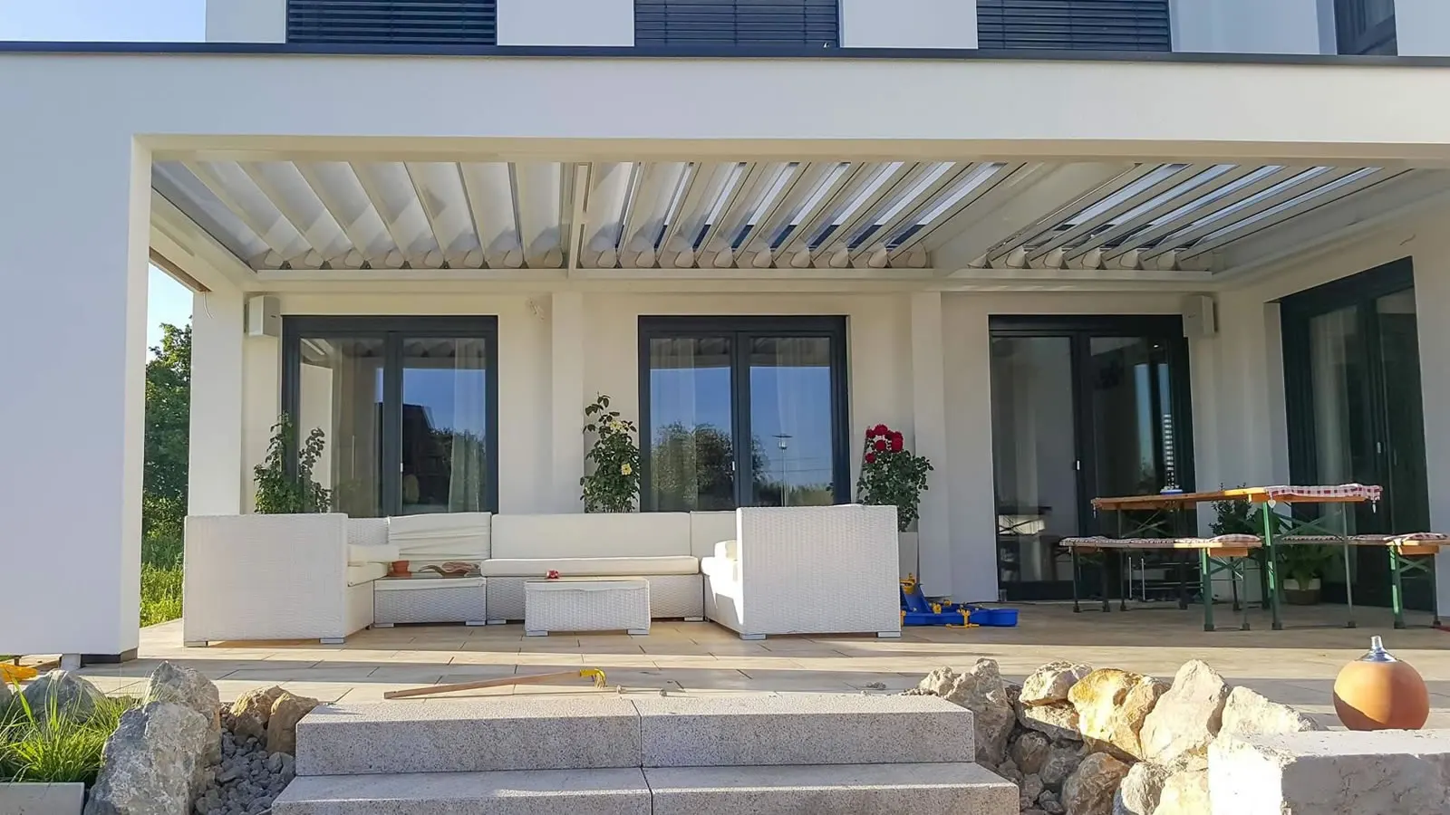 Lamellendach aus Aluminium passend zum mediterranen Stil des Hauses.