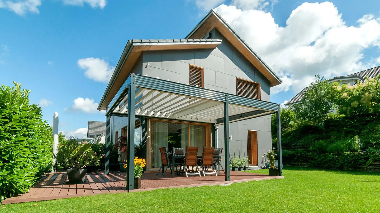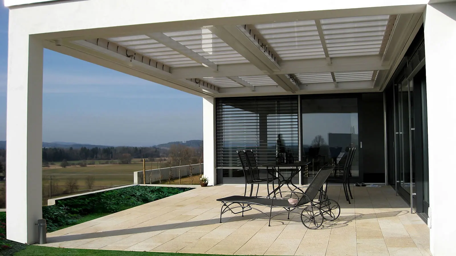 Lamellenüberdachung auf Terrasse kombiniert mit einer Markise auf der Westseite zum Schutz gegen die tief stehende Abendsonne.