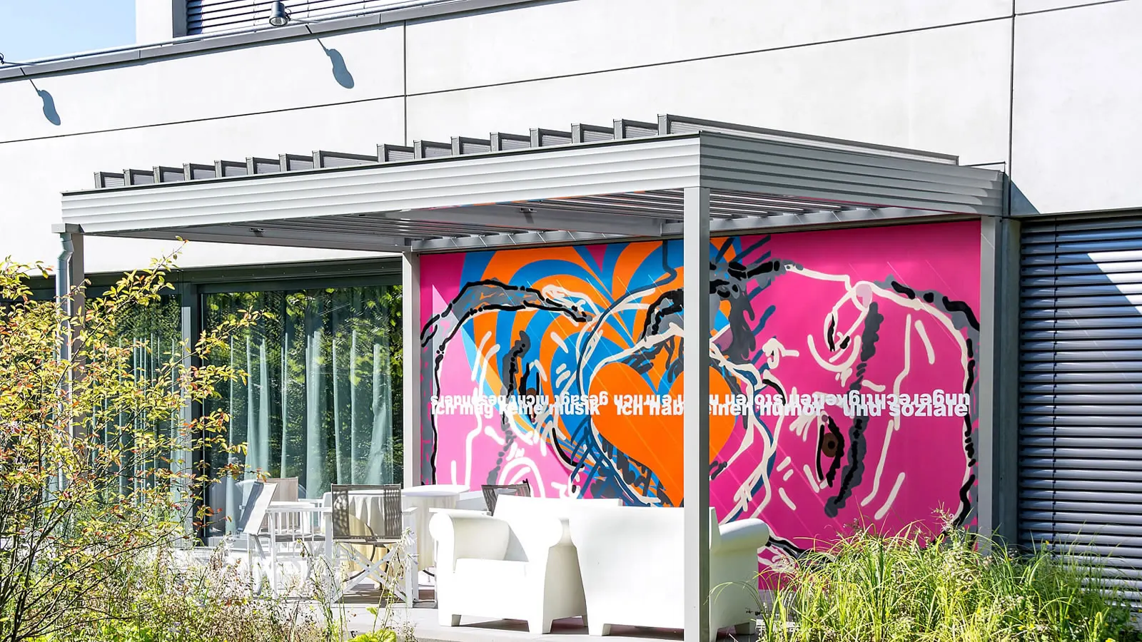 Lamellendaches ist ein eigens dafür angefertigtes Kunstwerk.