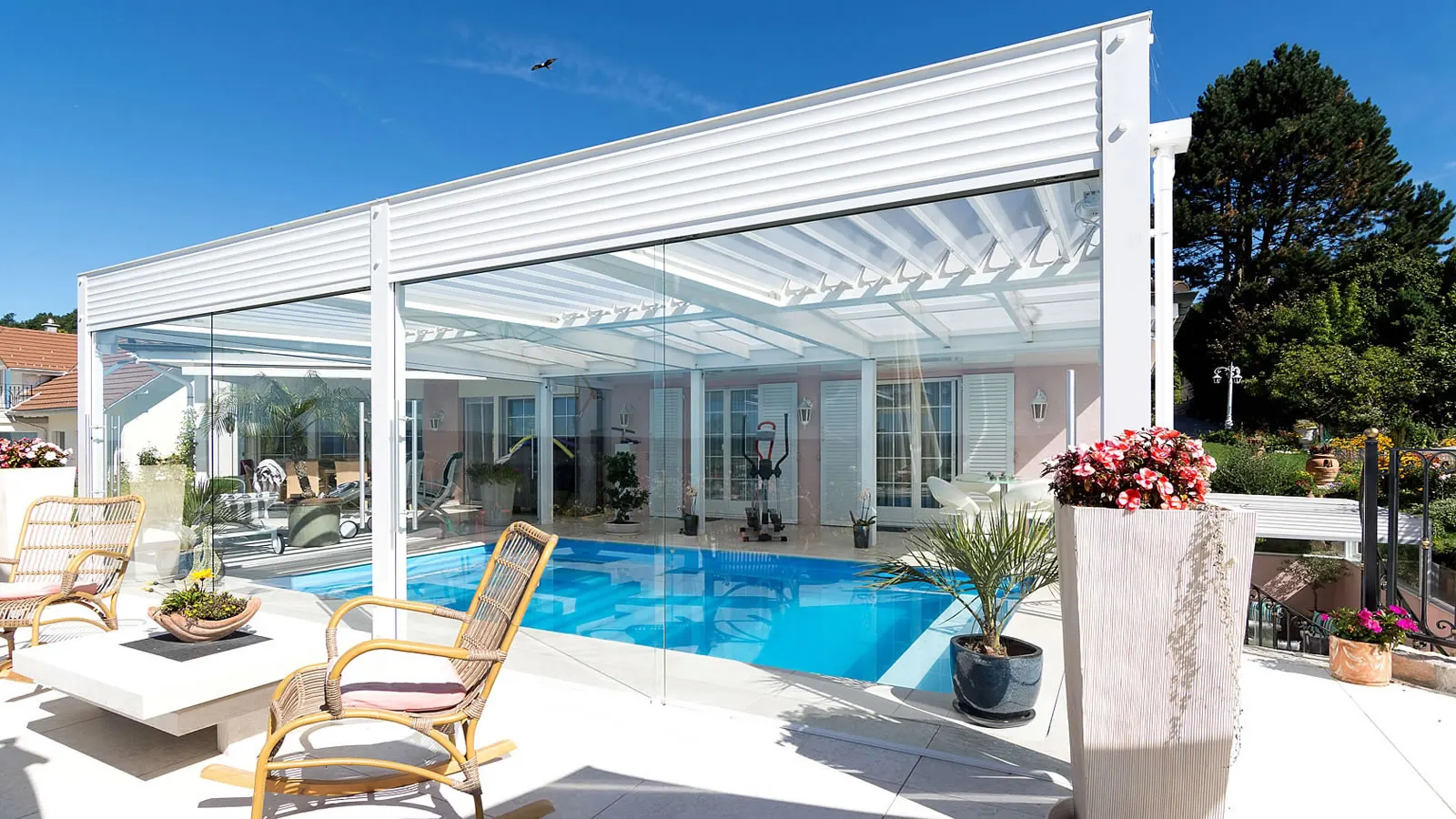 Poolüberdachung mit geöffneten teiltransparenten FLEDMEX