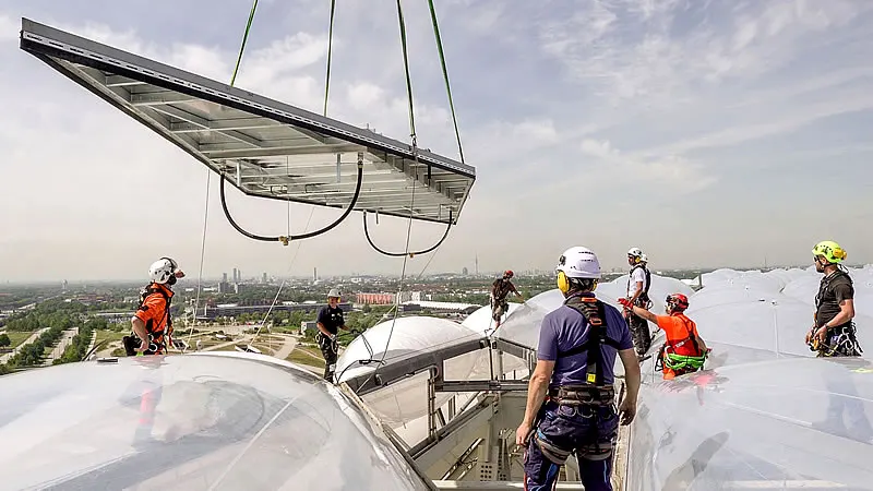 Lamellendach mit zwei unterschiedlichen Systemen. Links FLEDMEX