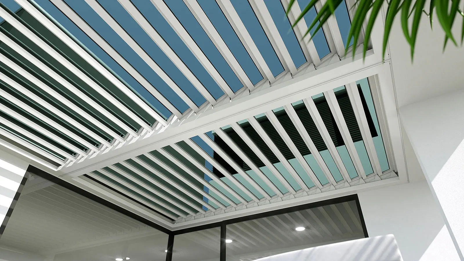 Innenansicht - Lamellendach aus Aluminium passend zum mediterranen Stil des Hauses.