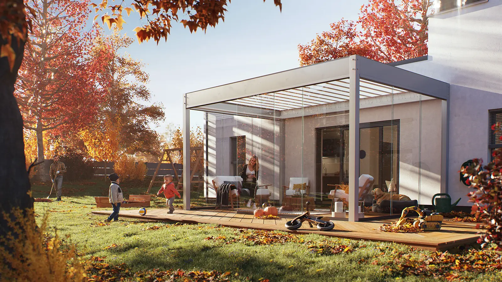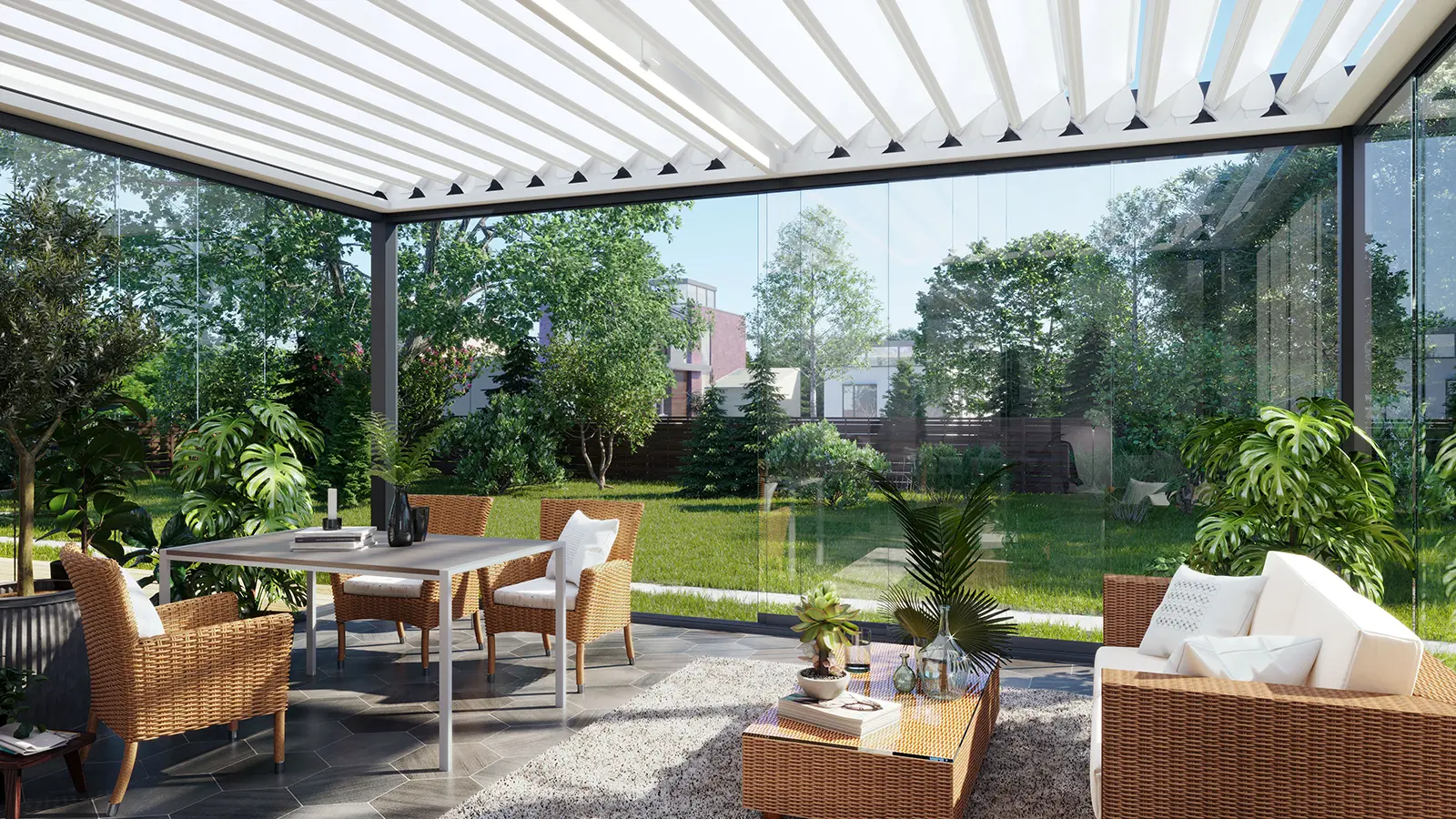 Ein Lamellendach mit ISO-Schiebeverglasung.