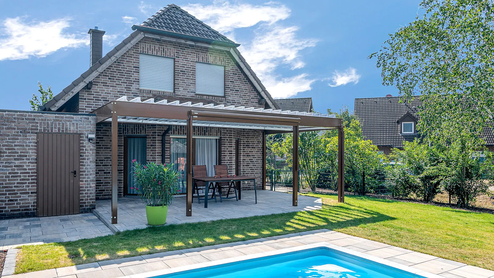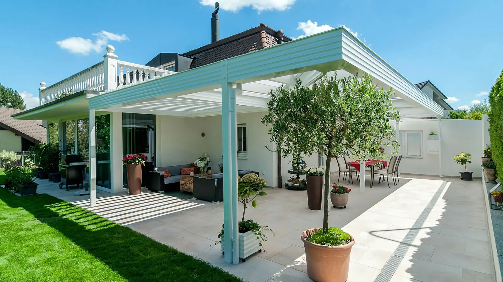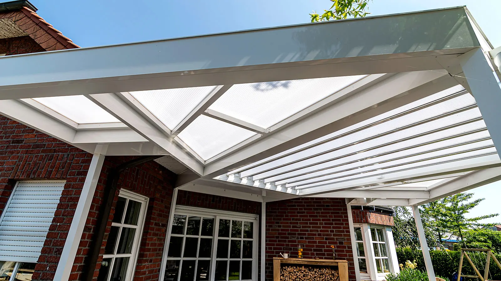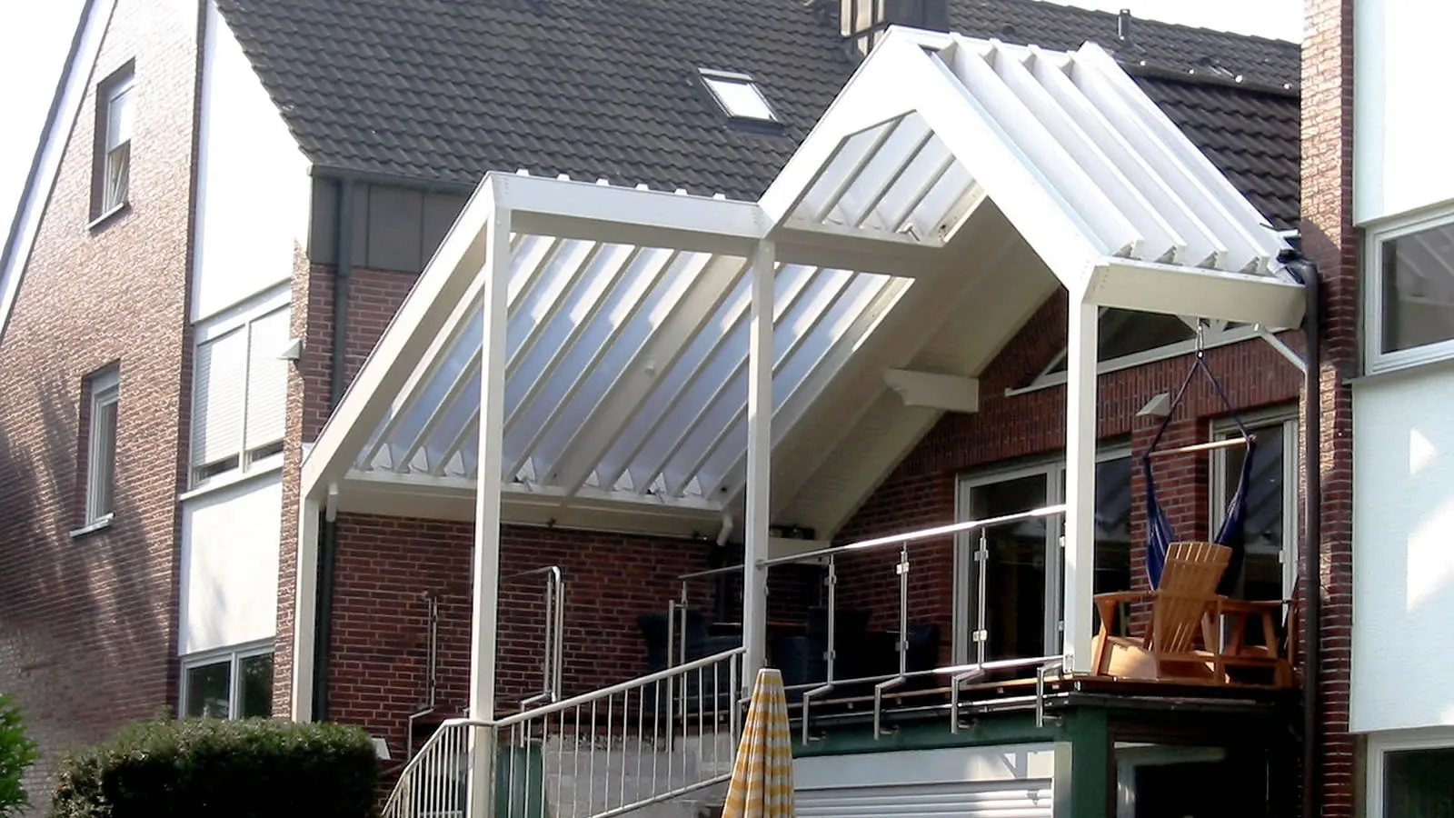 Lamellendach über Eck mit Überdachung des Hauseingangs.