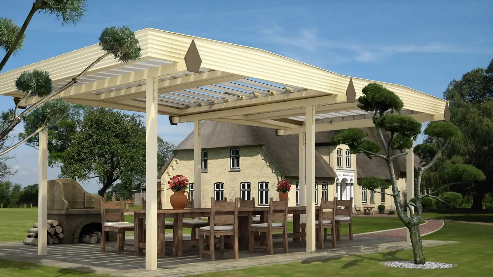 Im Garten freistehender Pavillon mit einem Lamellen-Doppelgiebeldach.