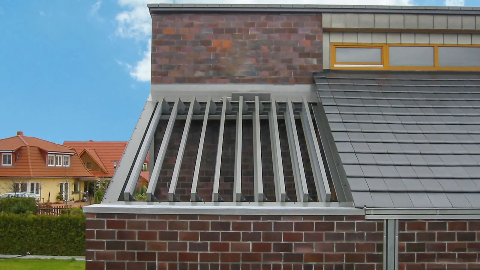Das Lamellendach am Hauseingang wurde angepasst an die bauseitige Dachneigung.
