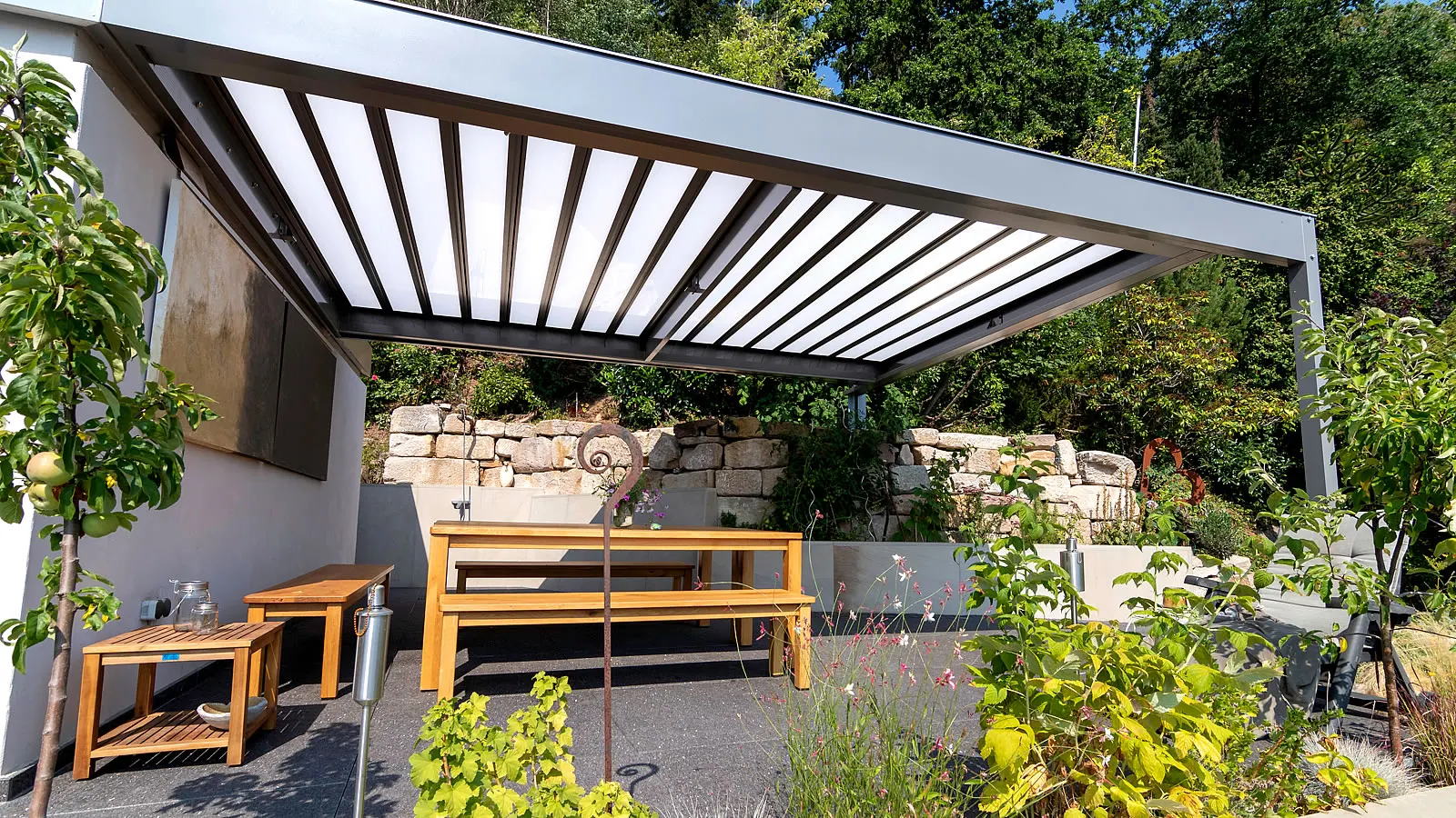 Lamellendach als Sonderform in eine Natursteinterrasse integriert.