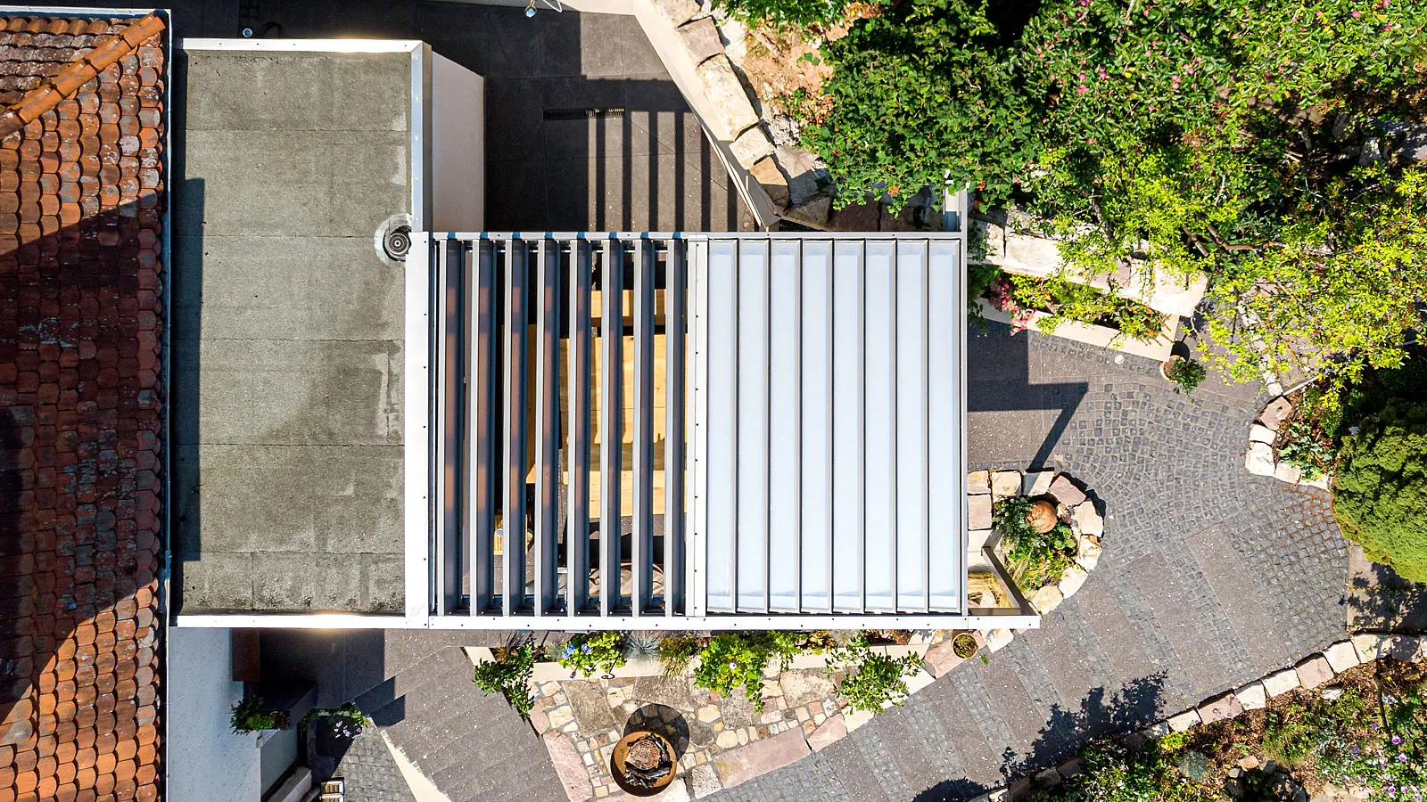 Ansicht von oben - Lamellendach als Sonderform in eine Natursteinterrasse integriert.