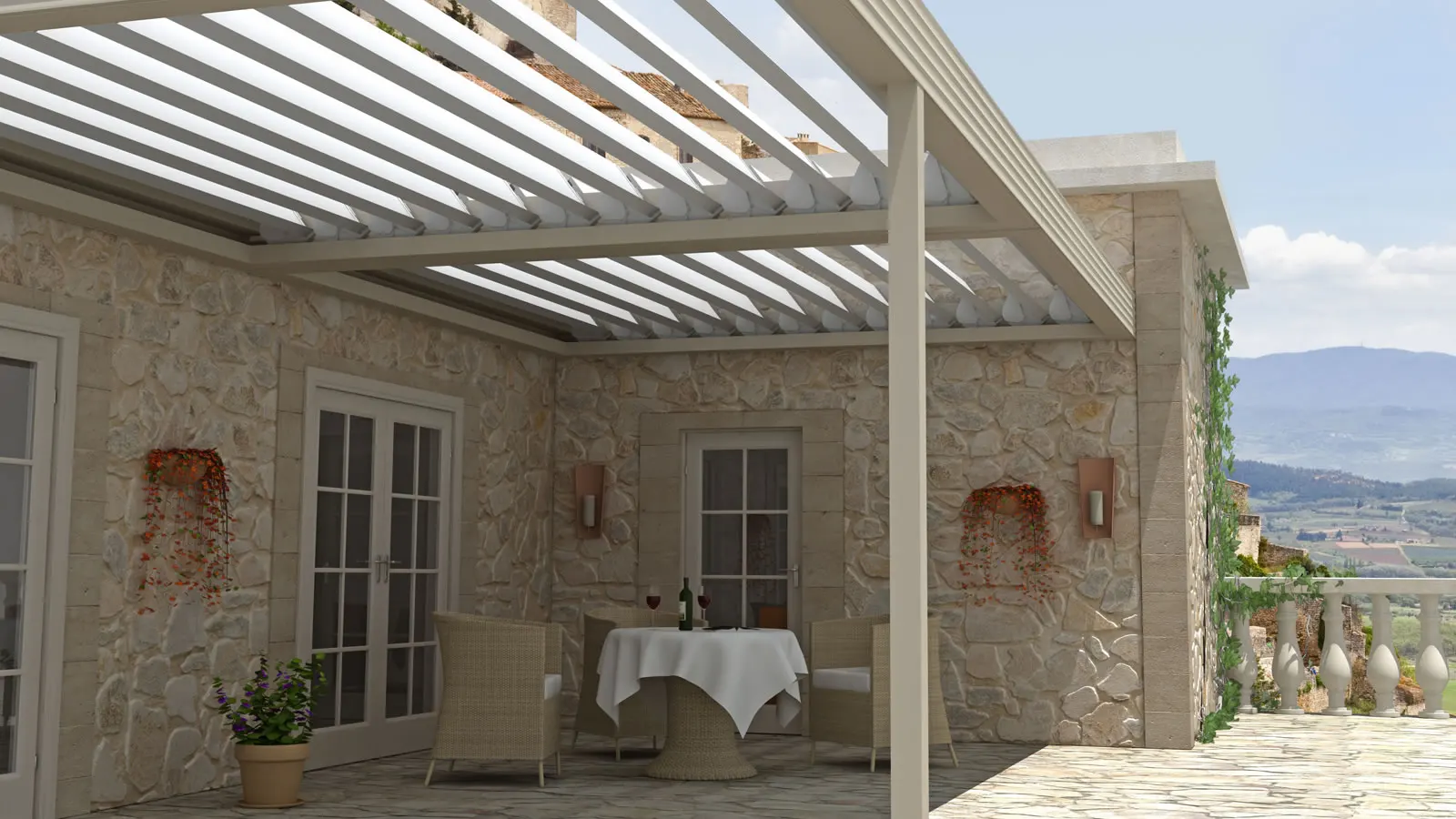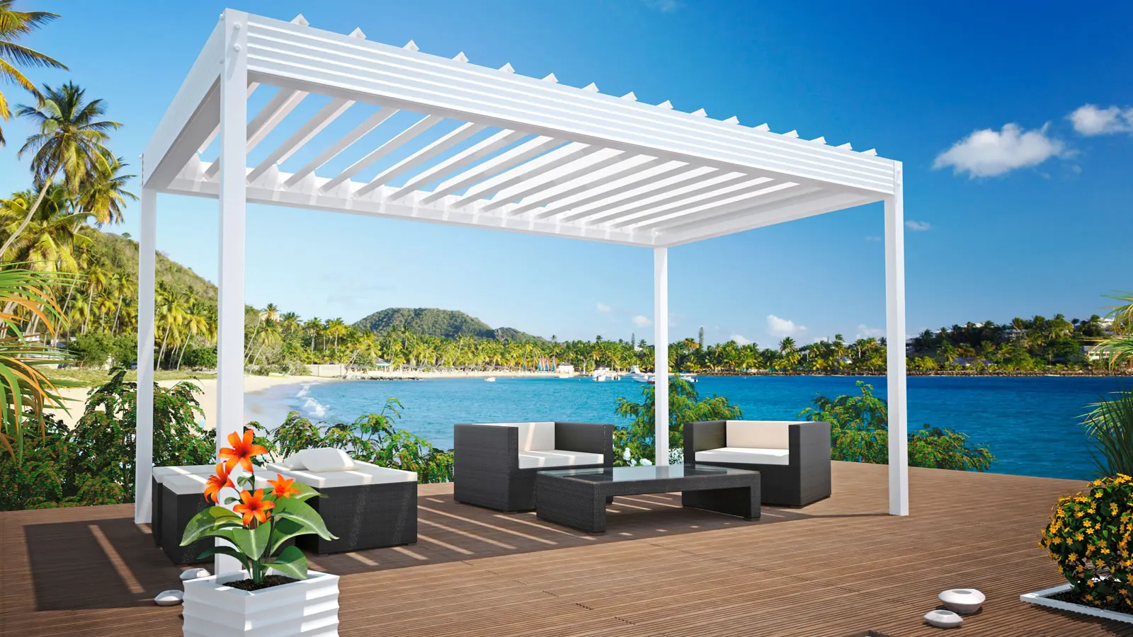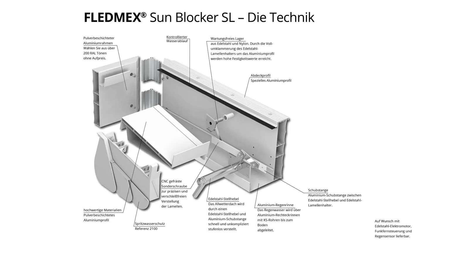 Diese Lamelle haben wir auf Grund der starken Nachfrage in Südeuropa nach einem hochwertigen lichtundurchlässigen Lamellendachsystem entwickelt. In Nordeuropa wird dieses System gerne für frei stehende Überdachungen verwendet.